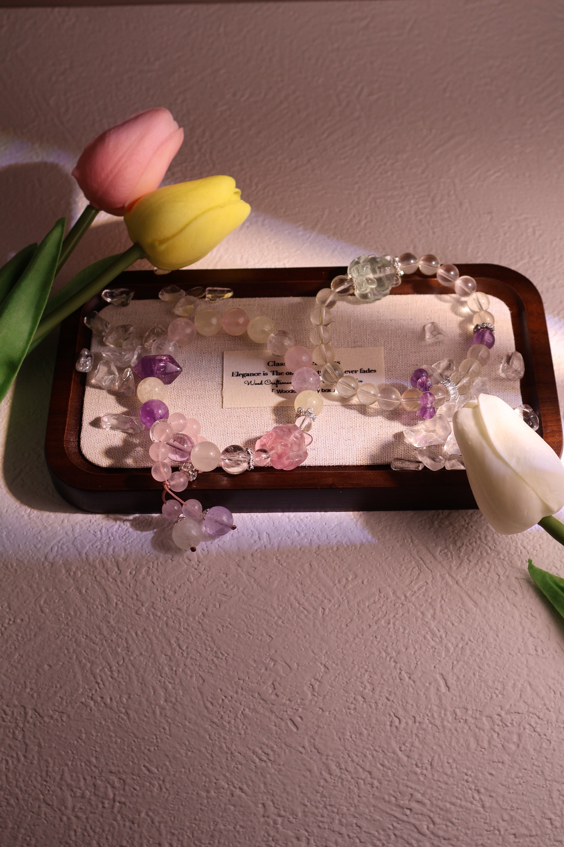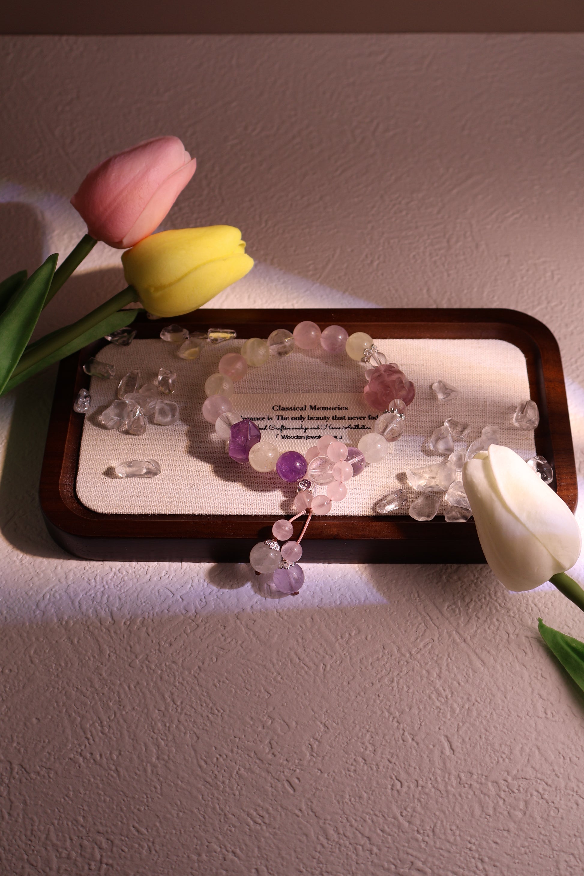 This is a multi-gemstone bracelet made of rose quartz, amethyst, citrine, and clear quartz, featuring a nine-tailed fox fluorite as the centerpiece.